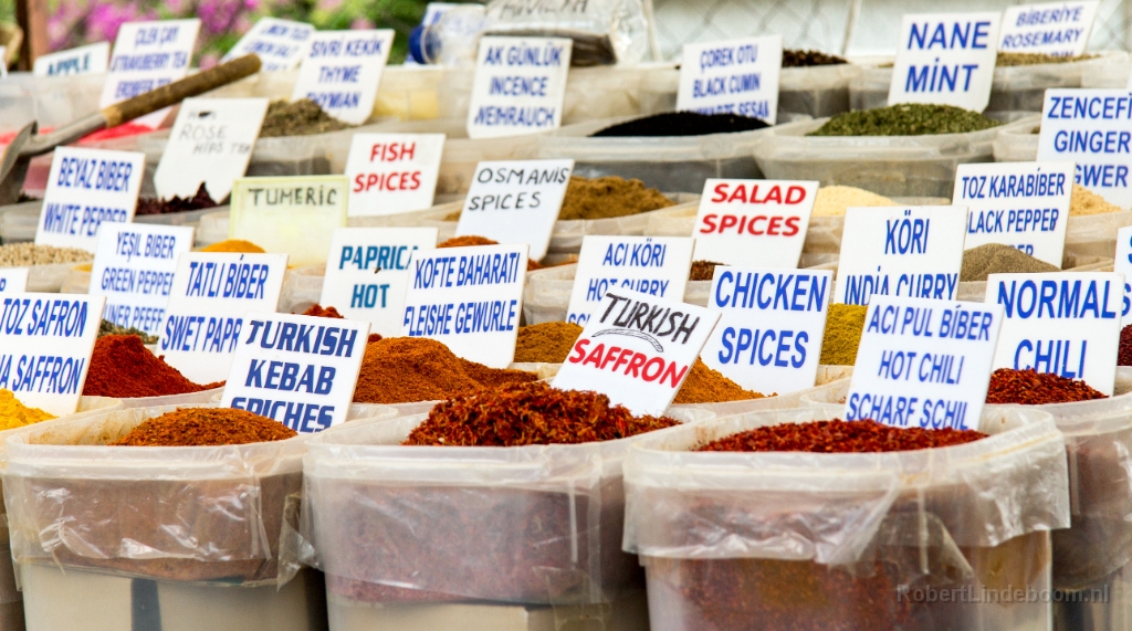 8Kruiden Op de grote bazar van Fethiye (Turkije) kan men naast groente, lederwaren en kleding ook kiezen uit een grote hoeveelheid kruiden.
