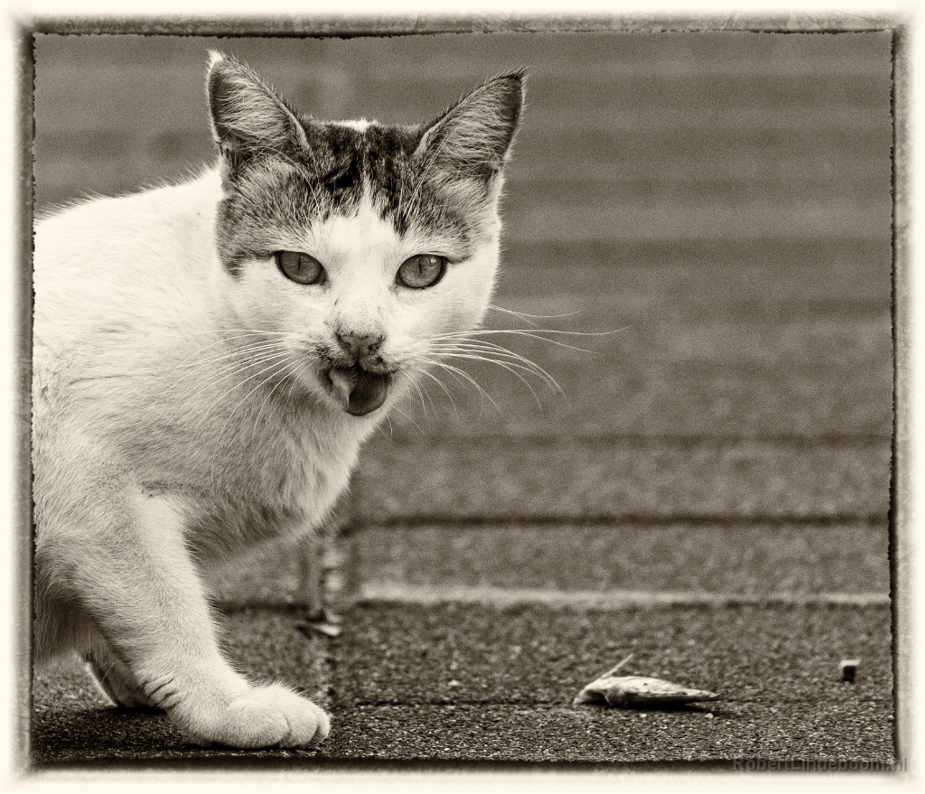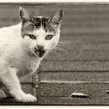7Kat met toegeworpen visje Deze kat lag geduldig te wachten bij wat vissende jongeren op de kade van de haven van Fethiye, Turkije.