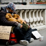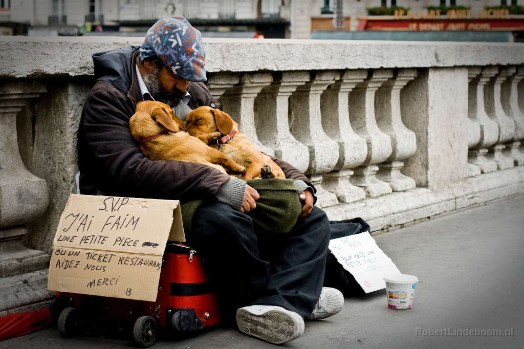 23J'ai faim Een bedelaar in Parijs. "S.V.P. J'ai faim. Une petite piece ou un ticket restaurant. Aidez nous. Merci". Op het andere bord staat: "S.V.P. J'ai faim. Pour photo une petite piece. Merci"